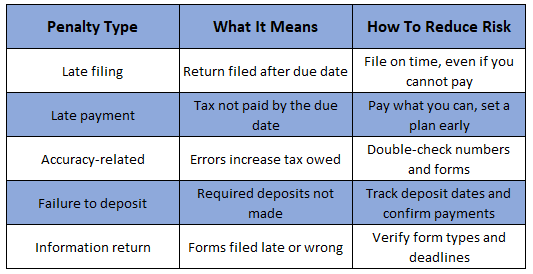 The IRS can charge penalties for different reasons. However, many penalties start with missed deadlines. So, acting early matters. Also, penalties may add interest over time. Therefore, delays can increase the total amount.